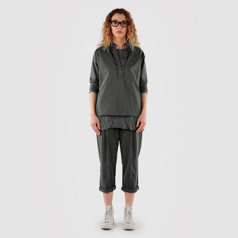 Pantalón en tejido Punto Milano mezcla de algodón, con banda elástica en la cintura. Pierna suave y ligeramente estrecha al dobladillo con detalle de cremallera. Ajuste amplio y cómodo.