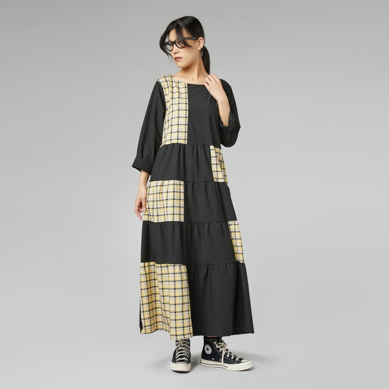 Vestido de paneles en doble tejido. Escote redondo. Hombros regulares y mangas largas. Falda plisada. Bolsillos laterales insertados en el corte. Corte largo. Ajuste amplio y cómodo.