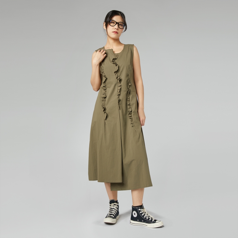 Vestido en mezcla de algodón. Sin mangas. Escote redondo irregular. Detalles con detalles de volantes. Bolsillos laterales insertados en el corte. Línea ligeramente ajustada. Ajuste regular.