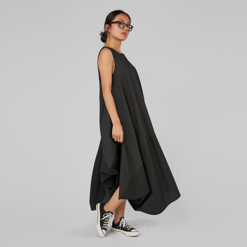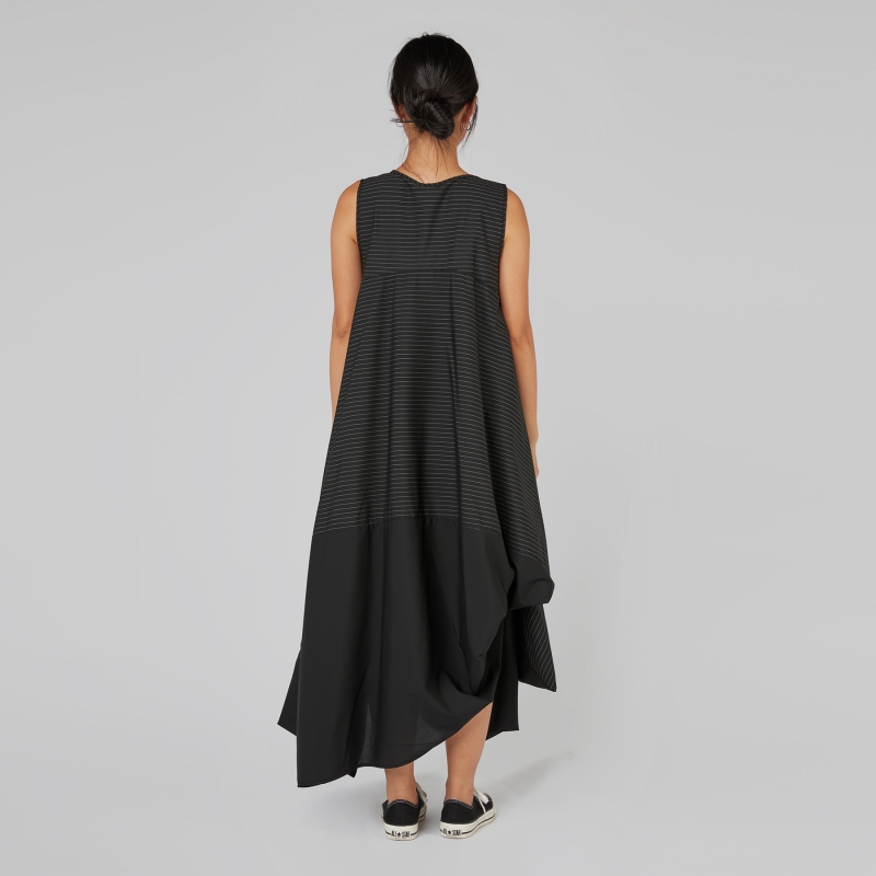 Vestido sin mangas en elegante tejido a rayas mezcla de viscosa. Cuello redondo con ribete. Corte largo y acampanado. Dobladillo asimétrico con acolchado lateral y detalles de punta en los laterales. Ajuste amplio y cómodo.