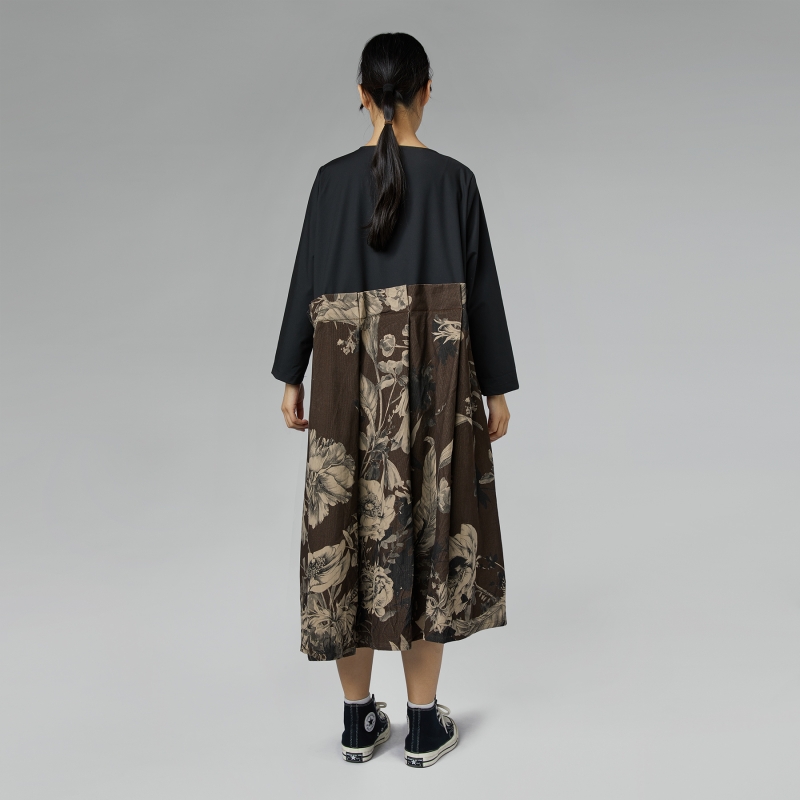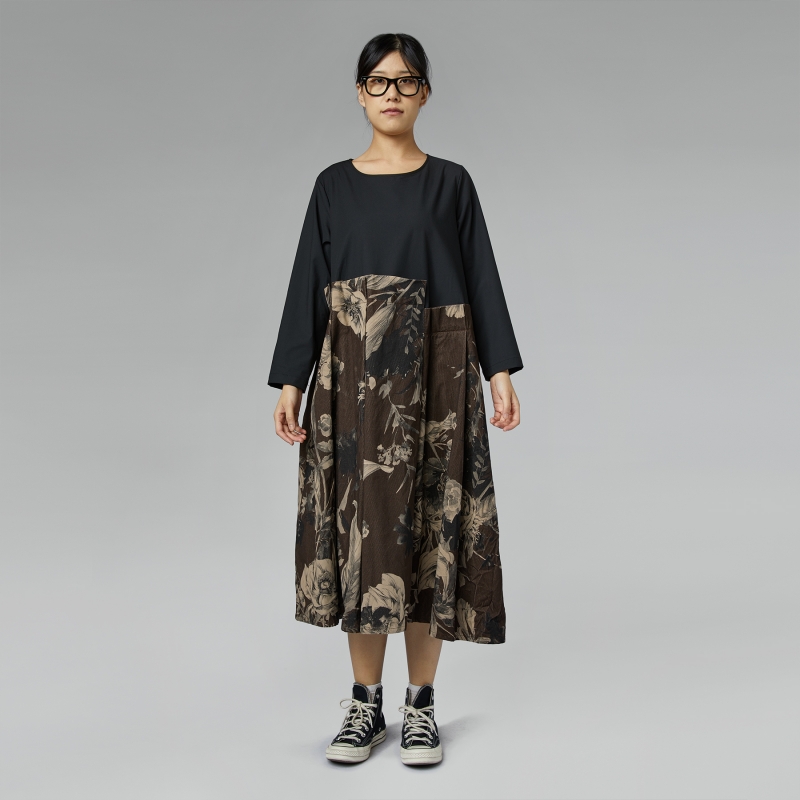 Vestido en doble tejido con falda de terciopelo a rayas de algodón estampado. Escote redondo. Hombro regular y mangas largas. Pliegues asimétricos en la cintura. Bolsillos laterales ocultos. Corte largo. Ajuste cómodo.