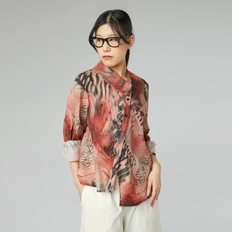 Chemise en coton avec impression d’ailes de papillon. Col mi-long. Fermeture avant asymétrique à boutons. Épaule régulière et manches longues avec poignets. Poche avec rabat appliqué sur la poitrine. Ajustement confortable.