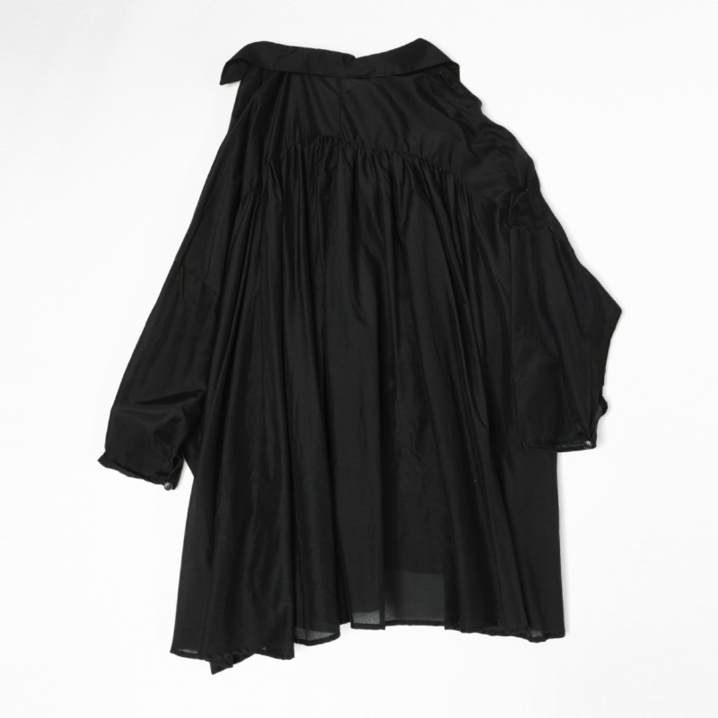 Chemise semi-transparente en mélange de coton et viscose. Col pointu. Fermeture frontale à boutons. Épaule abaissée et manches longues. Poches latérales insérées dans la couture. Plis à l’arrière. Coupe ample et confortable.