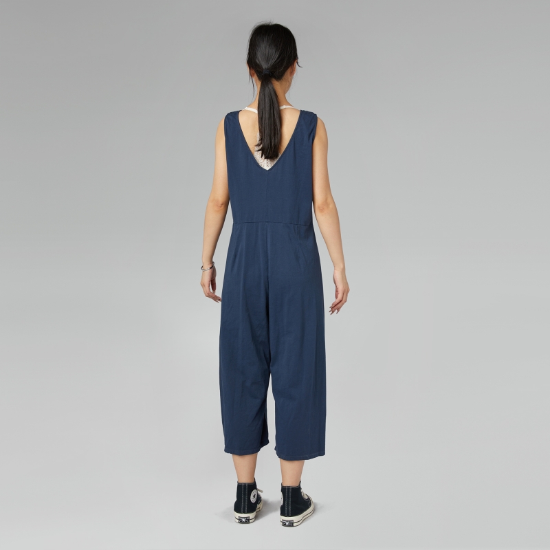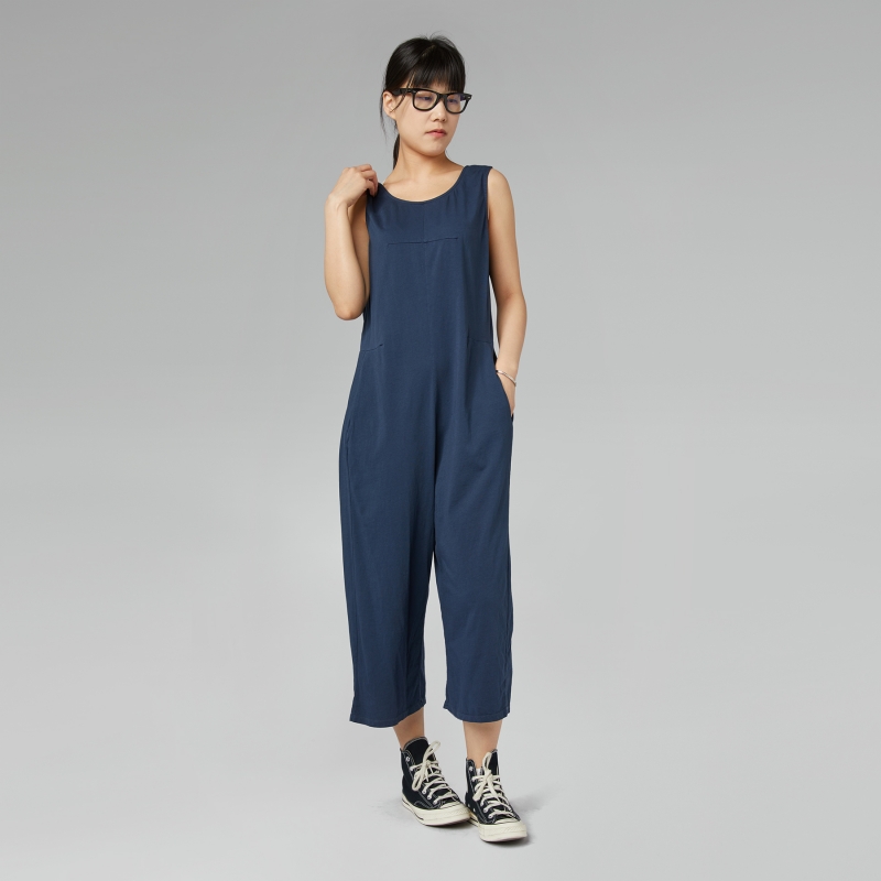 Combinaison sans manches en jersey de coton. Col ovale, entrejambe souple et poches latérales insérées dans la couture. Jambes larges et droites. Coupe confortable.