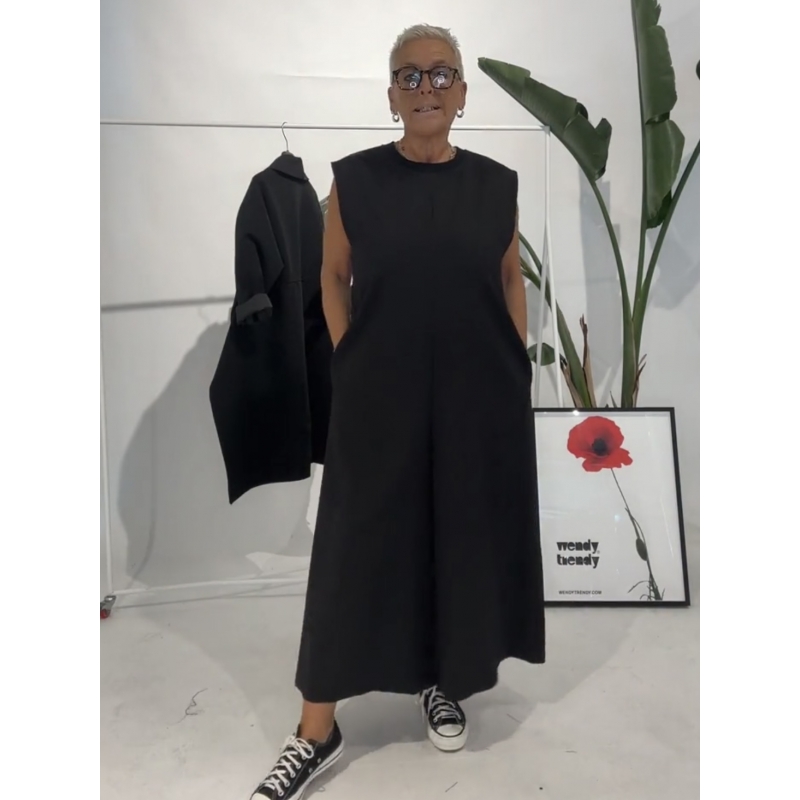 Combinaison sans manches avec fermeture à glissière sur le dos. Col rond avec élastique. Poches latérales rétractables. Entrejambe légèrement bas. Ajustement confortable.
