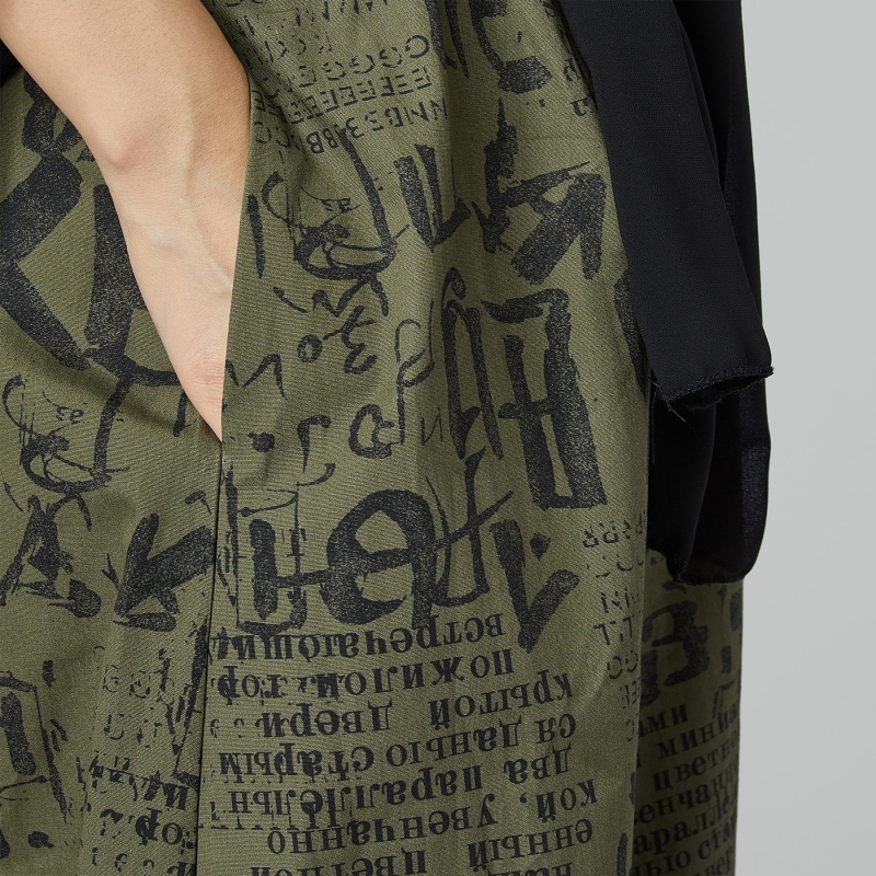 Pantalon en coton imprimé à inscriptions. Bande élastique à la taille avec passants et ceinture en tissu intégrée. Poches latérales rétractables. Plis sur la cheville. Large et confortable.
