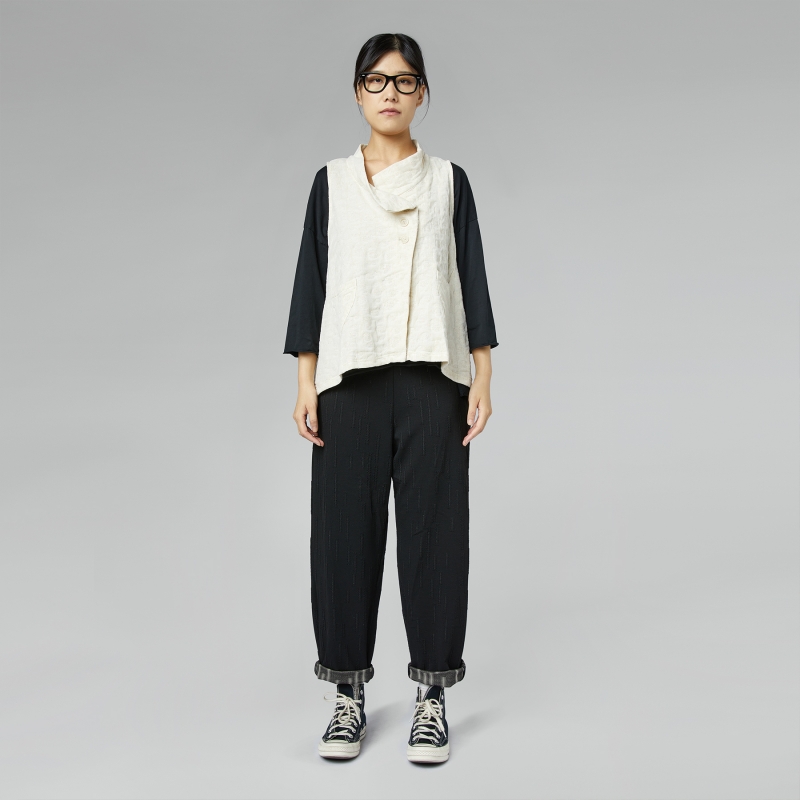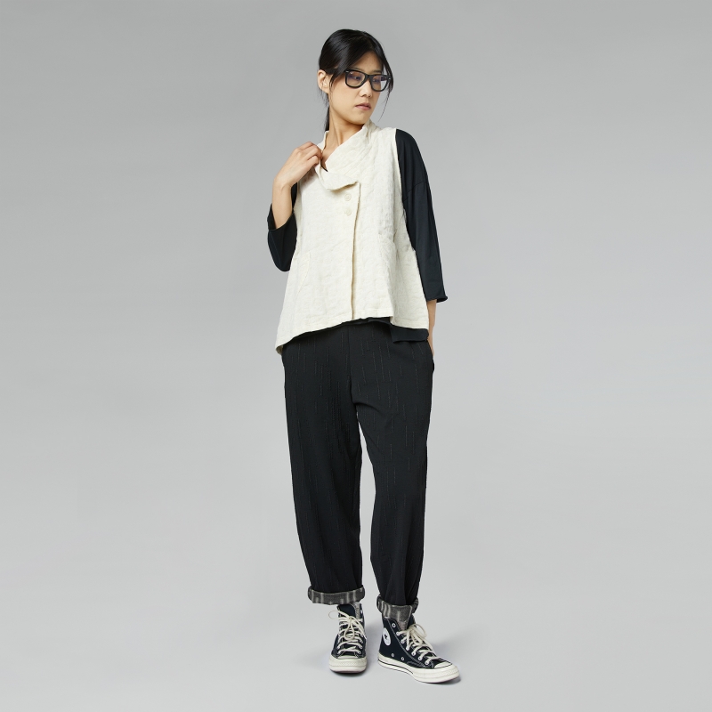 Pantalon en tissu embossé. Bande élastique à la taille. Poches latérales escamotables. Revers en motif contrasté. Ligne droite. Ajustement confortable.