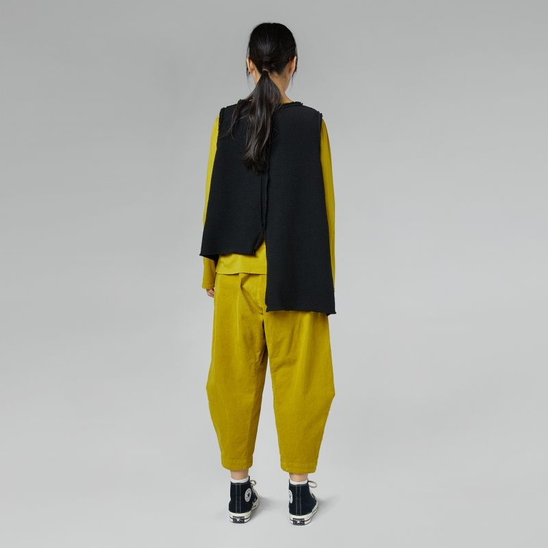 Pantalon en velours côtelé de coton élastique. Bande élastique à la taille, entrejambe souple et large et légèrement rétréci à la cheville. Poches latérales à lunette et fausses poches sur le dos. Détail faux rabat avant. Coupe baggy. Ajustement large et confortable.