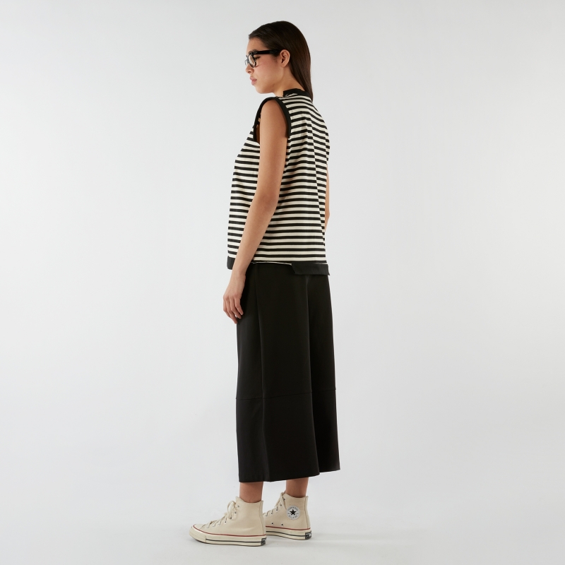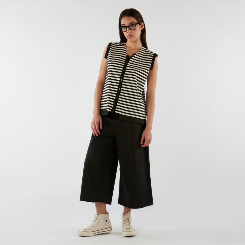 Pantalon culotte en tissu Punto Milano mélange coton élastique. Bande élastique à la taille. Détail couture sous le genou. Jambes larges. Ajustement confortable.
