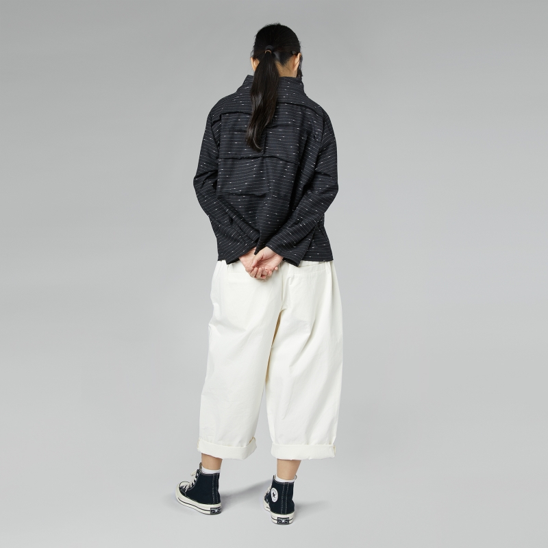 Pantalon en coton mi-saison. Bande élastique à la taille avec fermeture à bouton et zip. Poches latérales insérées dans la coupe. Coupe baggy. Un ajustement confortable.