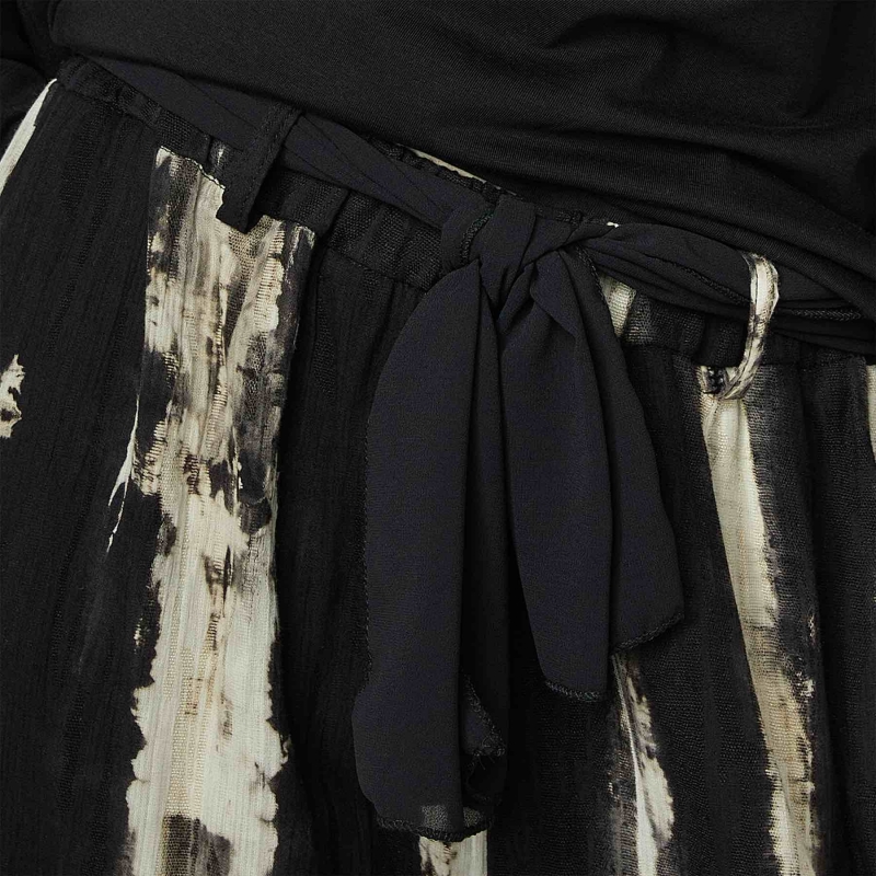 Pantalon souple en tissu rayé. Bande élastique à la taille avec passants et ceinture en tissu intégrée. Poches latérales rétractables. Plis sur la cheville. Large et confortable.