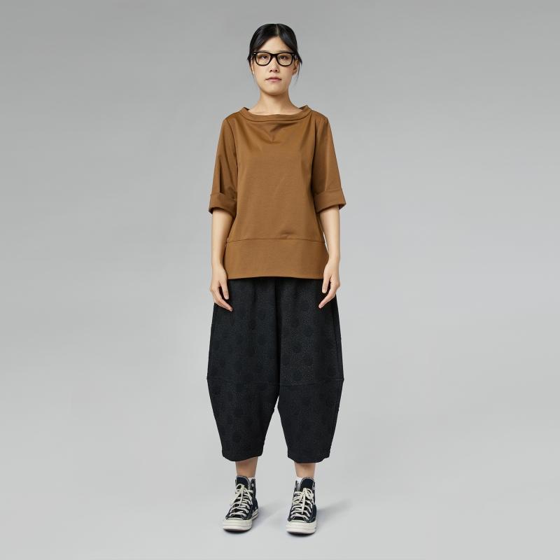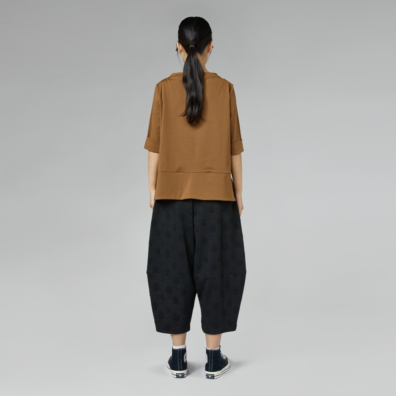 Pantalon en tissu à pois embossé en mélange de rayonne. Ceinture élastiquée. Poches latérales insérées dans la coupe. Entrejambe lâche. Coupe courte et confortable.