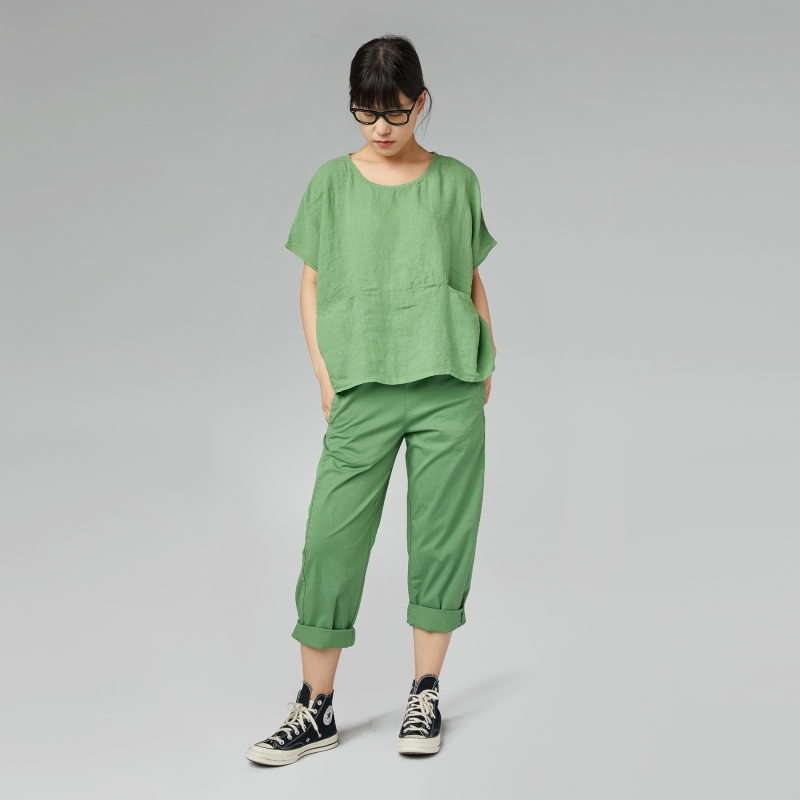 Pantalon simple en coton. Bande élastique à la taille. Poches latérales rétractables. Coupe régulière et confortable.