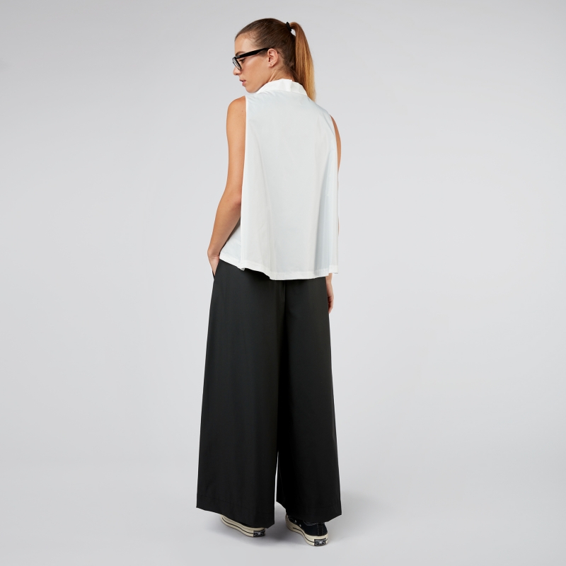 Pantalon palazzo en tissu mixte viscose avec plis à la taille. Bande élastique à la taille, passants pour ceinture et entrejambe souple. Poches latérales rétractables. Large et confortable.
