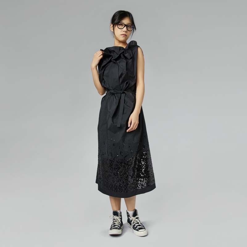 Robe en taffetas avec des paillettes sur l’ourlet. Décolleté plissé. Taille réglable avec ceinture intégrée. Sans manches. Coupe longue. Ajustement confortable et élégant.