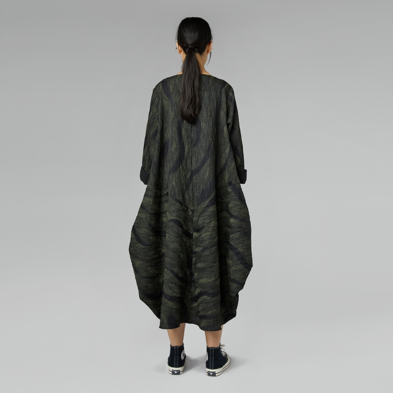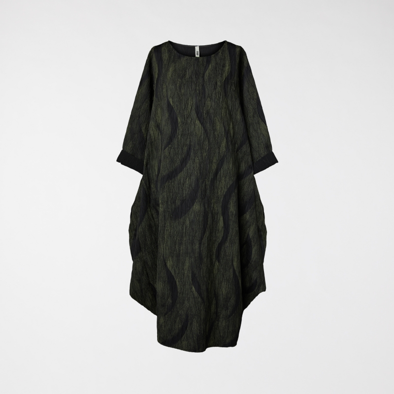 Robe lourde en tissu synthétique effet gaufré. Encolure ronde. Épaule régulière et manches longues. Poches latérales escamotables. Ligne à l’œuf. Coupe ample et confortable.