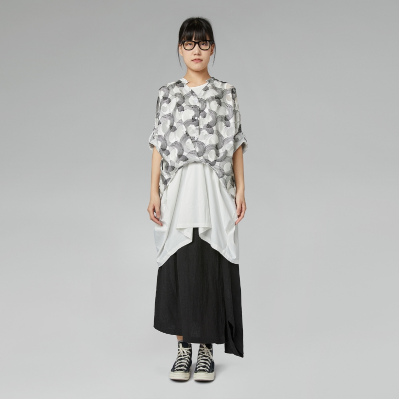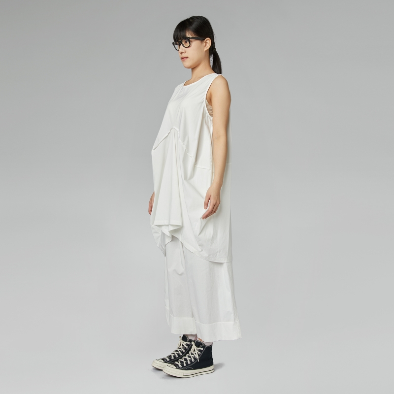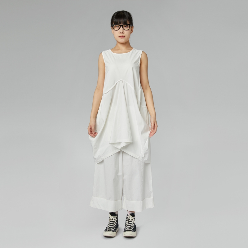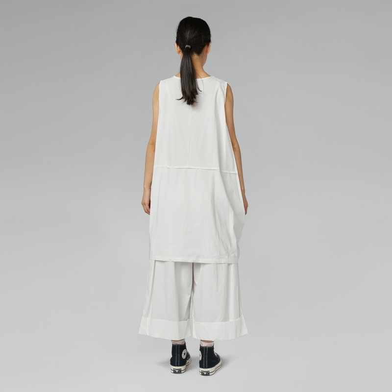 Robe sans manches avec pli central. Encolure ronde. Plus long à l'arrière. Ligne légèrement en forme d'oeuf. Coupe ample et confortable.