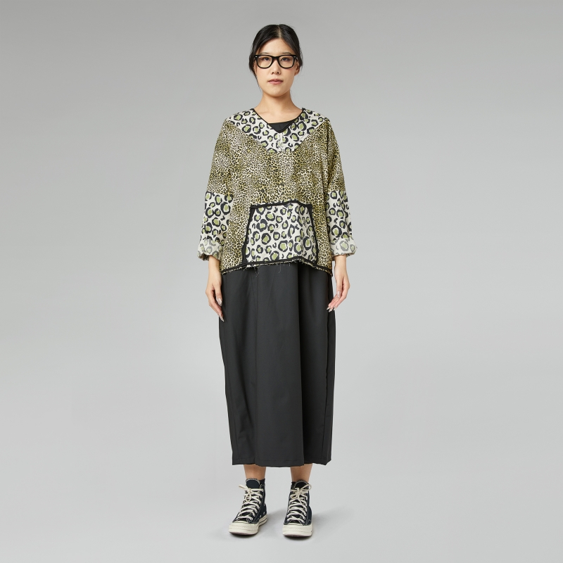Blouse en 100% coton avec imprimé animalier. Encolure en V. Ourlet à coupe vive avec bordures appliquées en jersey de coton. Épaule abaissée et manches longues. Poche frontale. Coupe carrée. Ajustement confortable et large.