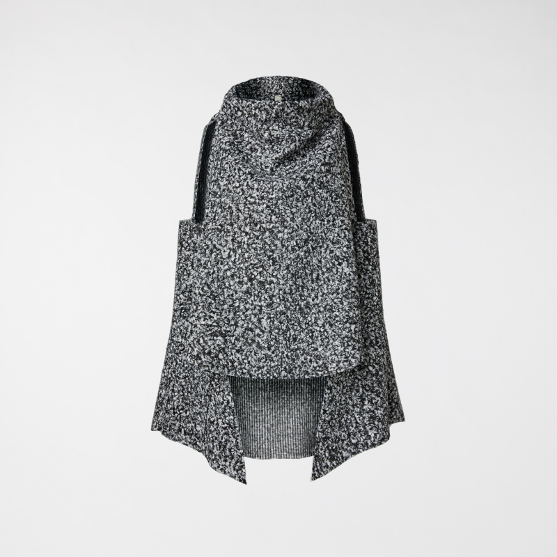Gilet sans manches avec col haut doux, ourlet avant cropped et dos plus long. Détail fentes latérales. Pas de fermetures. Coupe évasée et déstructurée. Large ajustement.