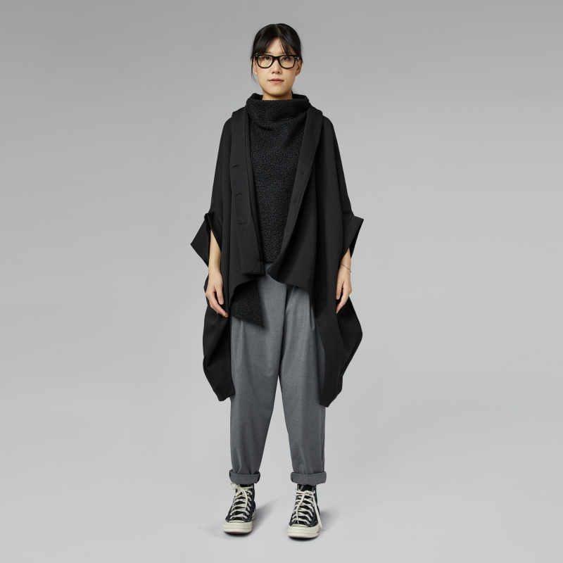 Gilet sans manches avec col haut doux, ourlet avant cropped et dos plus long. Détail fentes latérales. Pas de fermetures. Coupe évasée et déstructurée. Large ajustement.