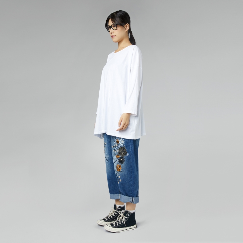 Haut ample en jersey de coton. Col rond. Épaule abaissée et manches longues. Coupe longue. Coupe large et confortable.