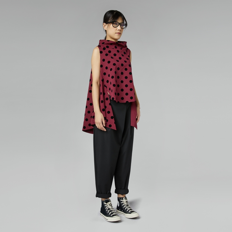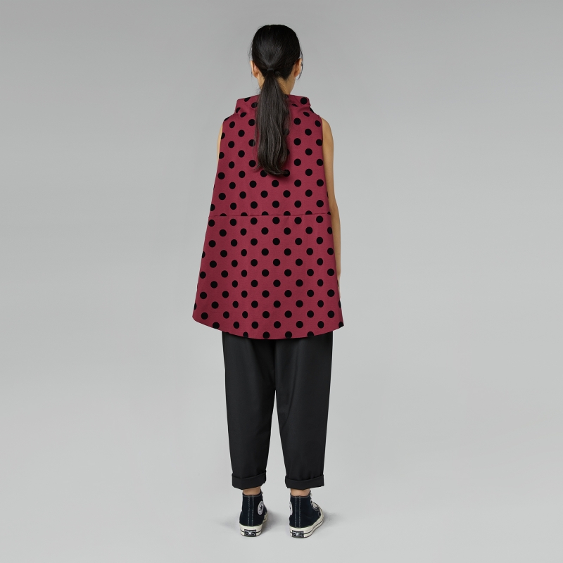 Gilet en maille Milano mélange de coton avec col haut doux. Motif à pois en velours. Ourlet avant arrondi, plus long à l’arrière. Détail de fentes latérales profondes. Coupe ample et évasée. Ajustement confortable.