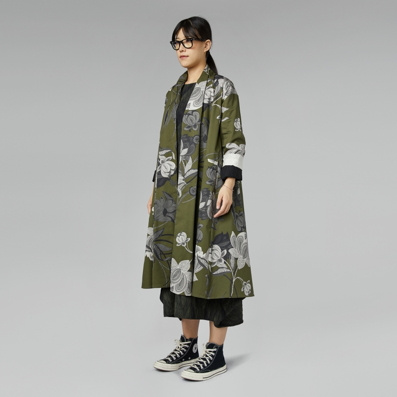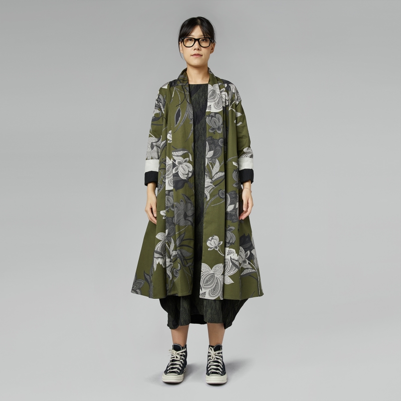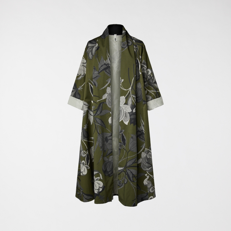 Cardigan ouvert en coton imprimé. Col châle doublé en viscose. Poches latérales appliquées. Épaules baissées et manches longues. Coupe large et confortable.