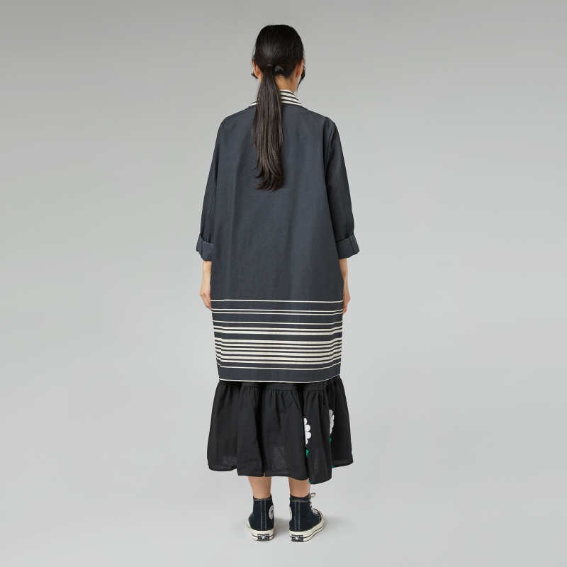 Parure rayée sur l’ourlet et le col. Fermeture avant à boutons. Épaules régulières et manches longues. Col pointu. Coupe asymétrique. Poches latérales insérées dans la coupe. Poids printanier. Ajustement ample et confortable.