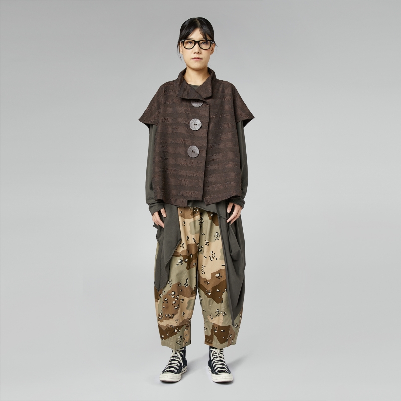 Gilet en tissu élaboré avec un petit pourcentage de laine. Fermeture frontale à boutons-pression. Épaule abaissée. Col souple. Ligne évasée. Coupe ample et confortable.