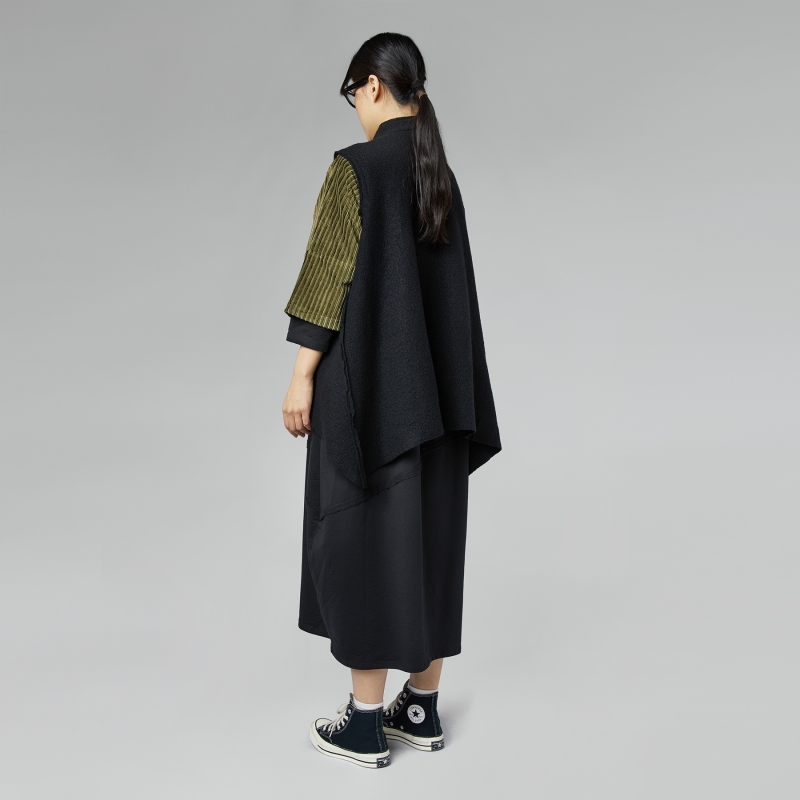Gilet en laine vierge. Double fermeture frontale à boutons. Effet col drapé. Plus long à l’arrière. Coupe asymétrique. Tenue chaude.