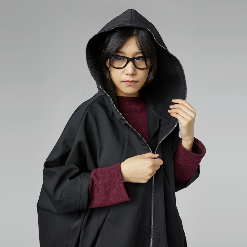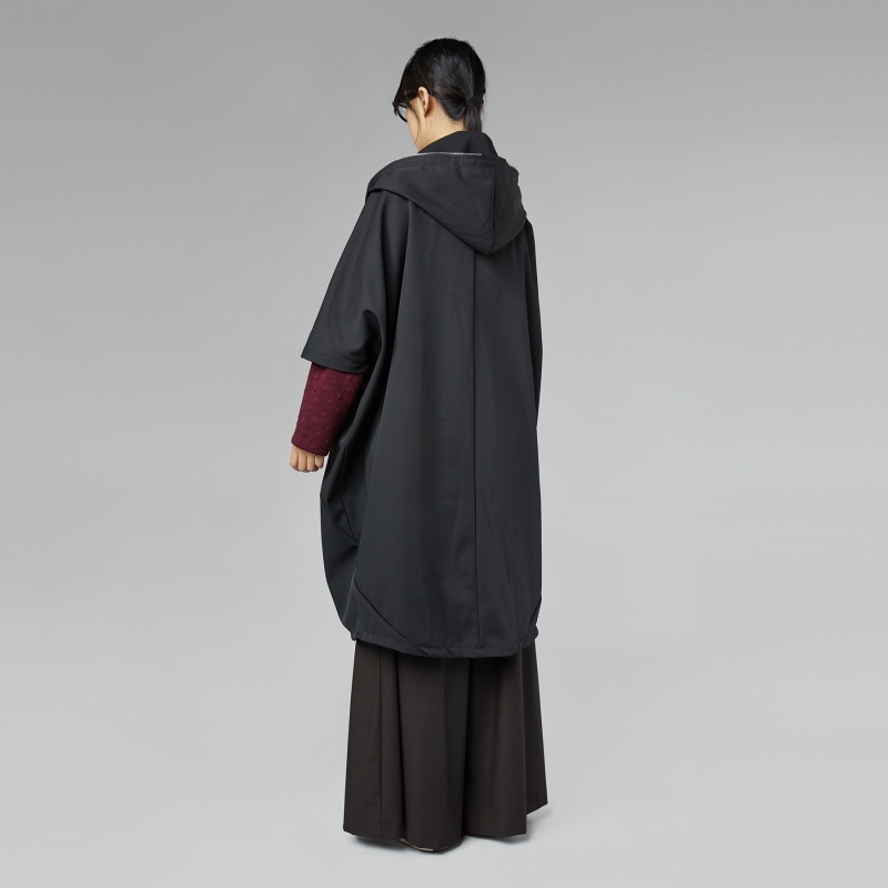 Large manteau en tissu semi-imperméable avec capuche. Fermeture zippée à l’avant. Épaule raglan et manches chauve-souris. Poches rétractables insérées dans la coupe. Fente au centre devant. Ajustement très large et confortable.