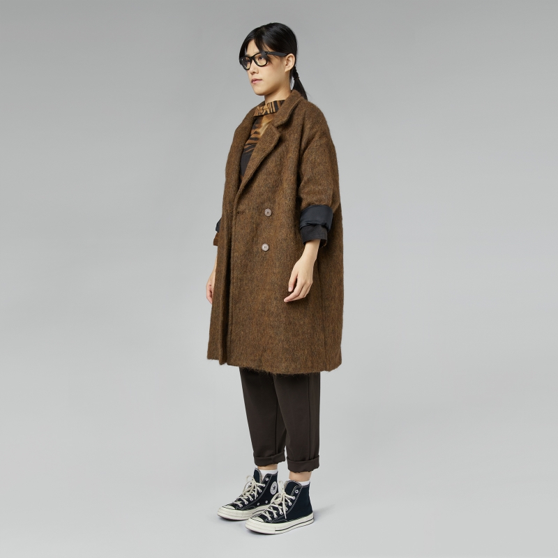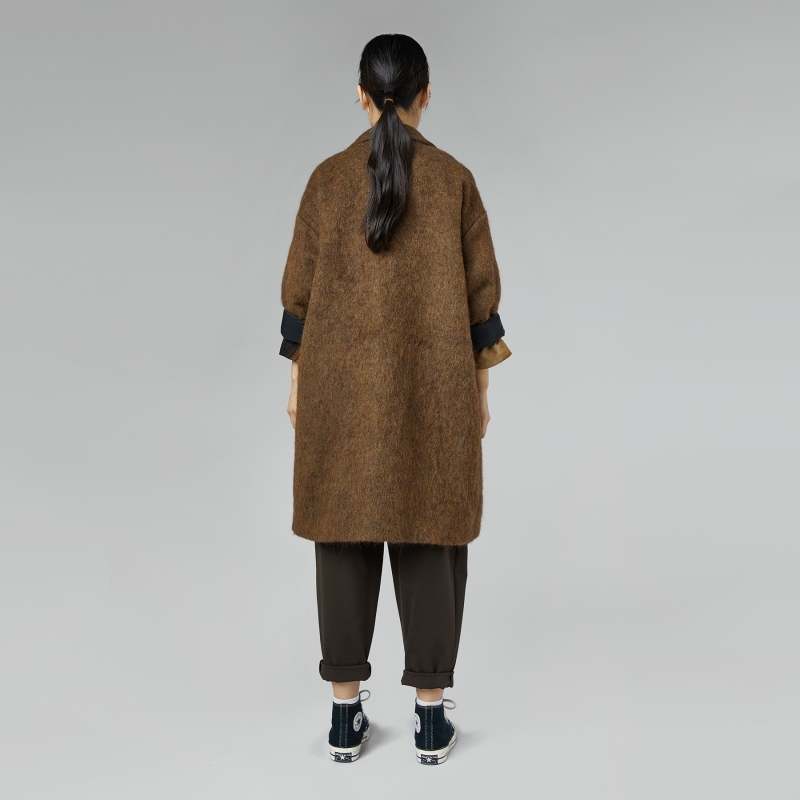 Manteau double-face en tissu à poils doux avec 28% laine et 9% alpaga. Col revers. Épaule abaissée et manches longues. Doublé. Poches latérales rétractables. Ajustement large et confortable.