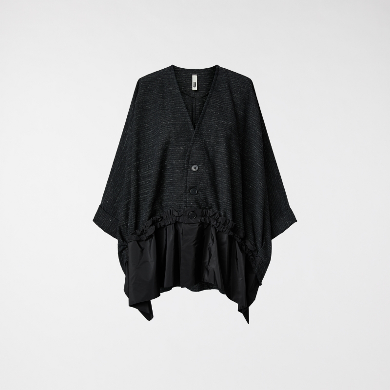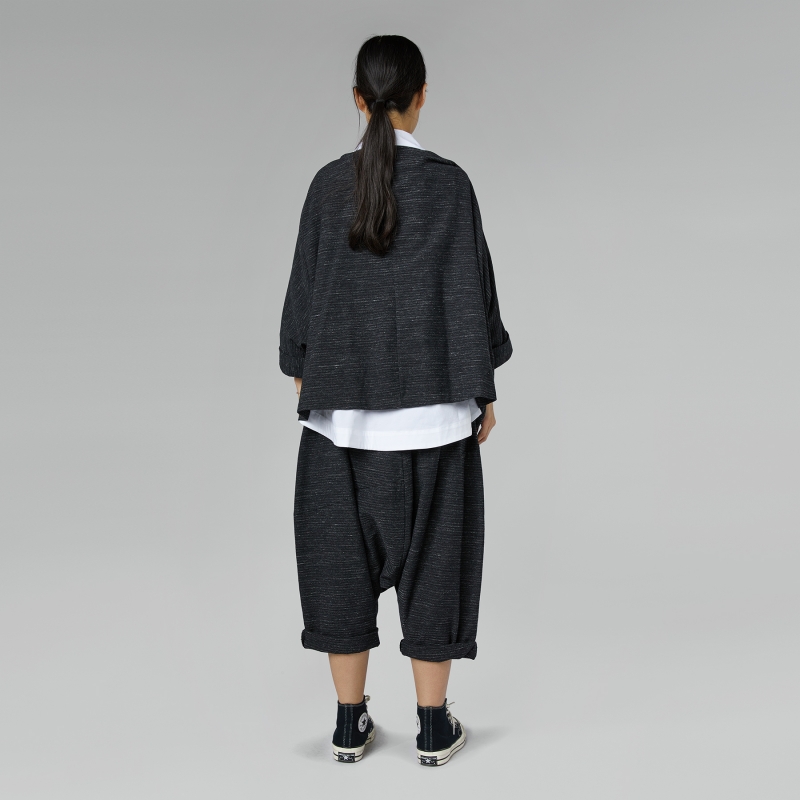 Veste en tissu à rayures gris melange en coton mélangé. Fermeture frontale avec boutons. Encolure en V. Épaules baissées et manches chauve-souris. Détail rouches. Ourlet en taffetas sur le devant. Rétro simple. Coupe ample et confortable.