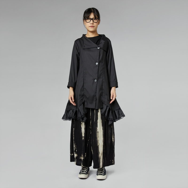 Veste élégante à rayures avec détail en tulle sur l’ourlet. Col haut souple. Fermeture avant à boutons asymétrique. Épaule régulière et manches longues. Ajustement régulier.