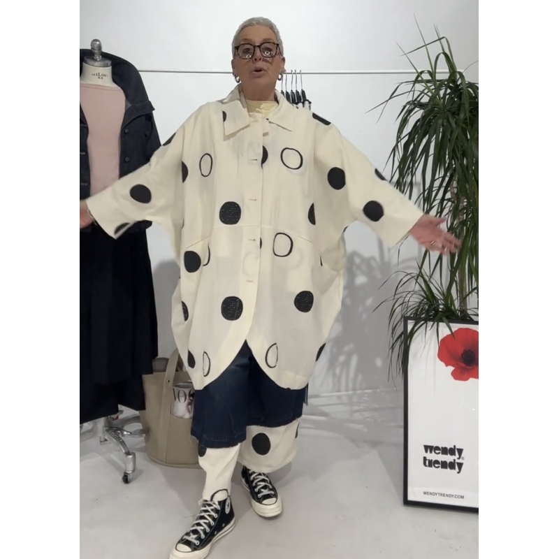 Veste kimono en tissu coton mélangé avec motif à pois. Col asymétrique. Fermeture frontale à boutons. Poches frontales insérées dans la coupe. Épaule abaissée et manches longues. Ourlet arrondi. Coupe ample et confortable.
