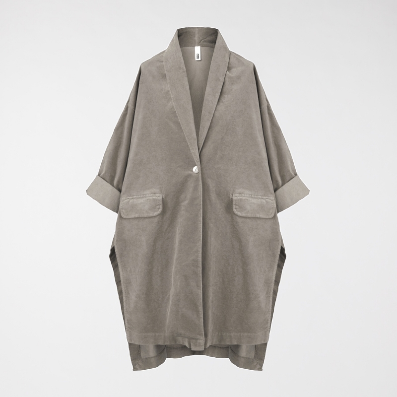 Veste Kimono en velours lisse de coton élastique avec fentes latérales. Col châle, épaule abaissée et manches longues. Poches frontales avec rabat. Coupe ample et volumineuse. Ajustement confortable.