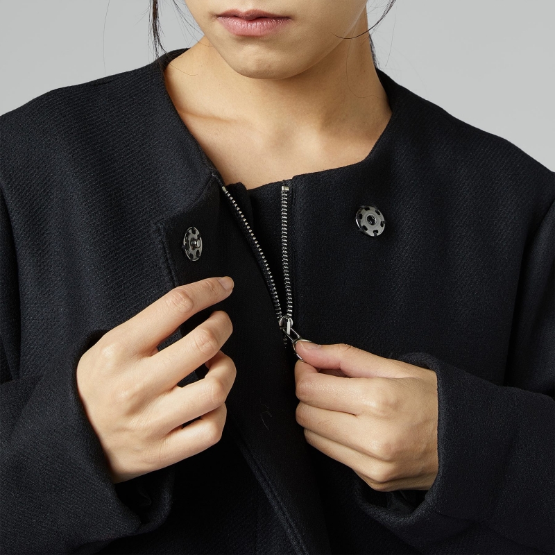 Manteau en mélange de laine vierge avec doublure intérieure. Fermeture frontale ovale avec zip invisible. Bouton pression sur le col rond. Épaule régulière et manches longues. Ajustement confortable et élégant.