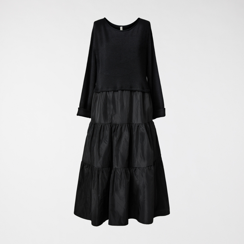Robe en double tissu avec dessus tricoté et jupe plissée, effet taffetas. Encolure profonde ronde à coupe vive. Épaule abaissée et manches longues. Ajustement confortable.