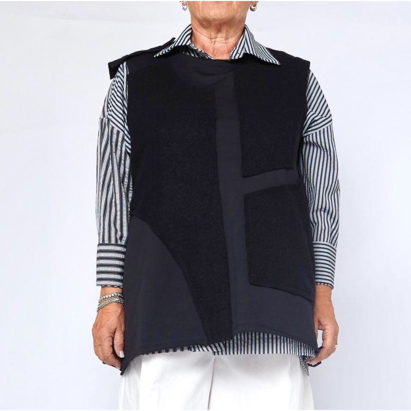 Gilet en molleton de coton avec incrustations en laine vierge. Encolure ronde irrégulière. Sans manches. Ourlets à coupe vive. Ajustement confortable.