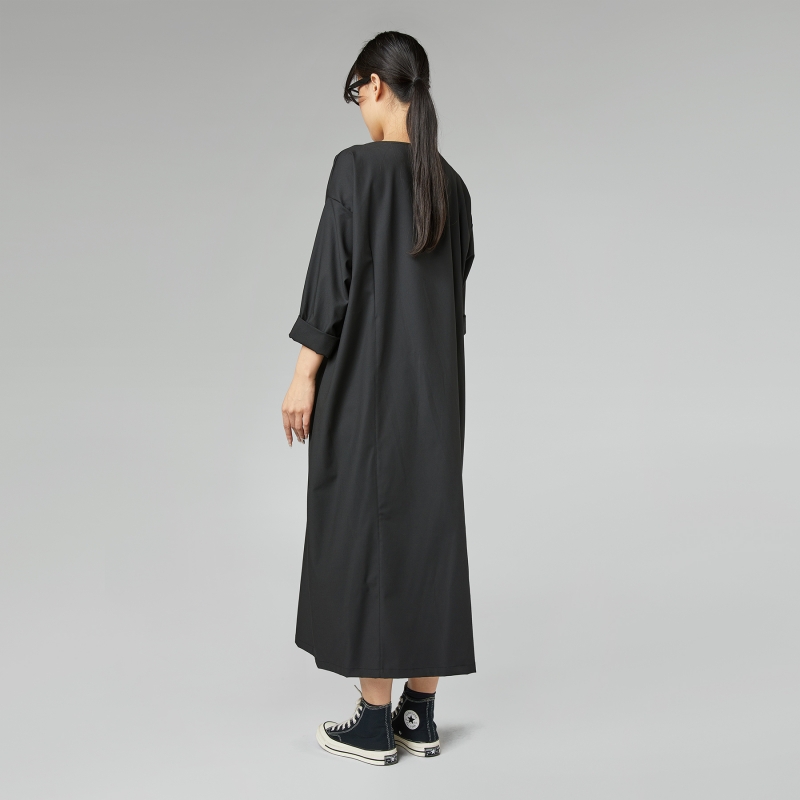 Abito in twill misto viscosa. Scollo tondo. Spalla calata e maniche lunghe. Tasche laterali inserite nel taglio. Linea diritta. Taglio lungo. Vestibilità ampia e comoda.