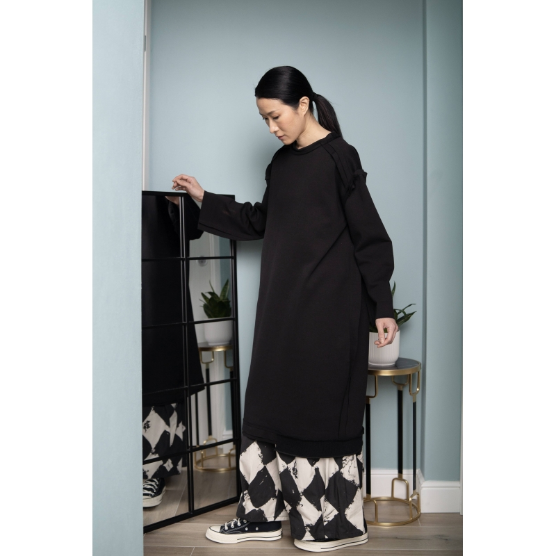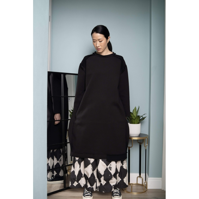 Abito in felpa pesante misto cotone effetto neoprene. Colletto tondo. Spalla calata e maniche lunghe. Cuciture esterne sul giromanica, sulle spalle e ai lati. Applicazioni in lana sul girocollo e sull'orlo. Fondo orlo a taglio vivo. Vestibilità larga e comoda.