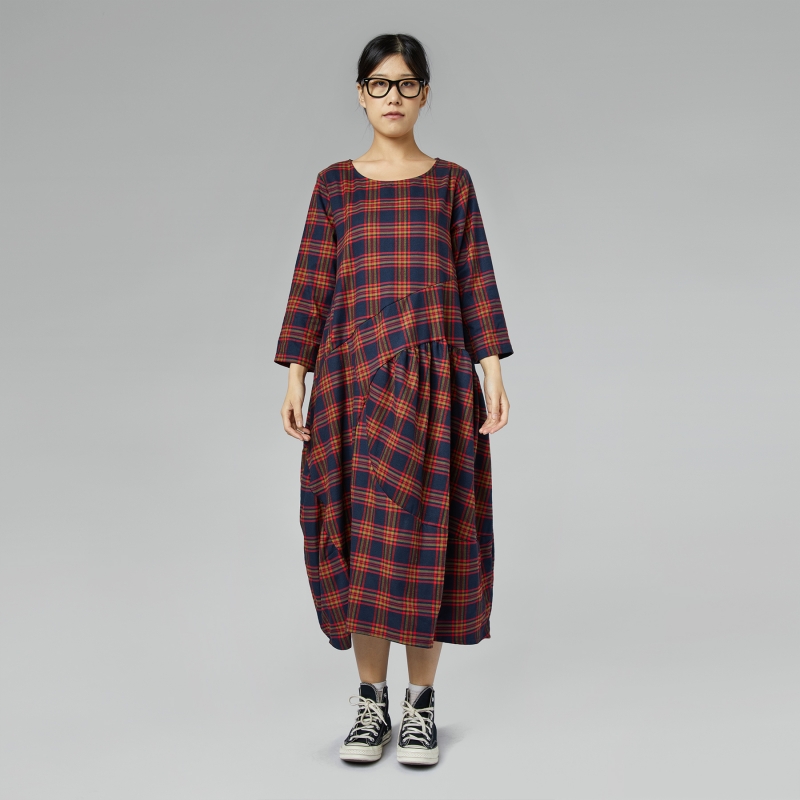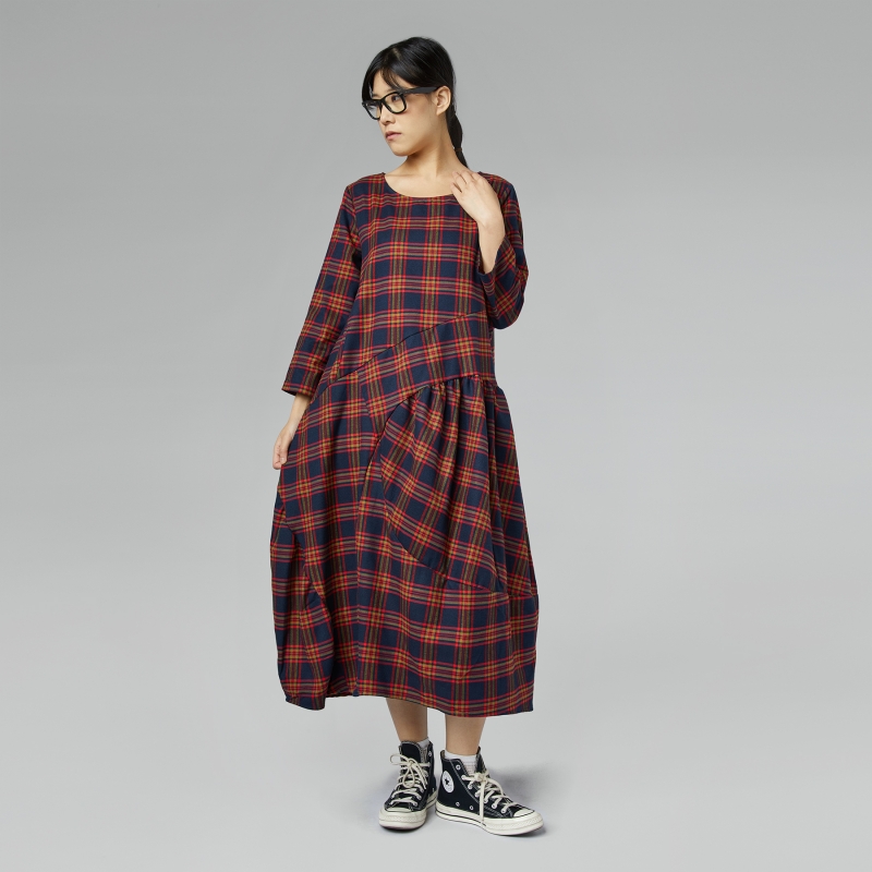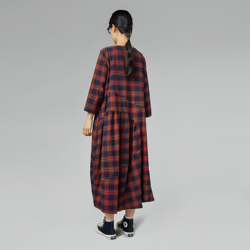 Abito in tessuto tartan di cotone. Scollo rotondo. Spalla regolare e maniche lunghe. Tasche laterali a scomparsa. Dettaglio a pieghe ovale. Vestibilità comoda e larga.
