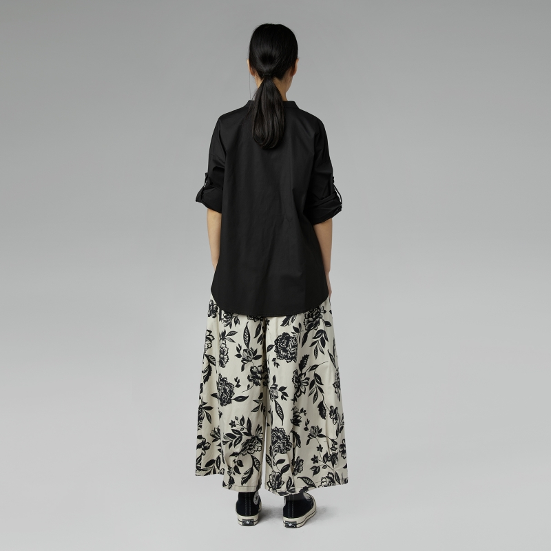 Blusa con colletto a scaletta in tessuto popeline di cotone. Spalla calata e maniche regolabili. Chiusura frontale con bottoni. Più lungo sul retro. Pieghe sul davanti. Vestibilità ampia e comoda.