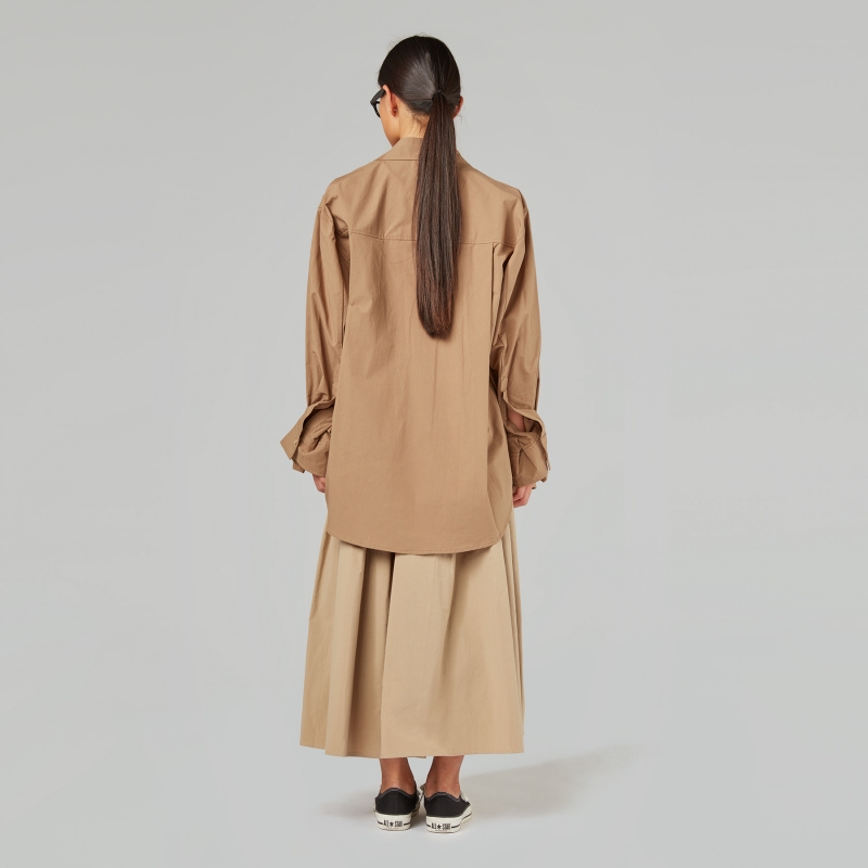 Camicia in gabardine leggera di cotone. Colletto a punta. Chiusura frontale a bottoni. Tasca sul petto. Spalle calate e maniche lunghe con polsino con dettaglio pieghe. Orlo stondato. Vestibilità over e comoda.