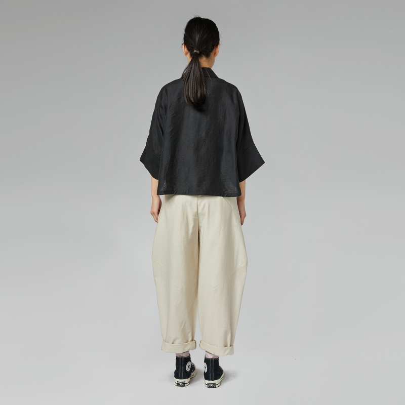 Camicia in tessuto leggero misto lyocell. Colletto a punta. Spalle calate e maniche corte e larghe. Chiusura frontale a bottoni. Apertura a bottoni sotto le maniche. Linea svasata. Semi trasparente. Vestibilità ampia e comoda.