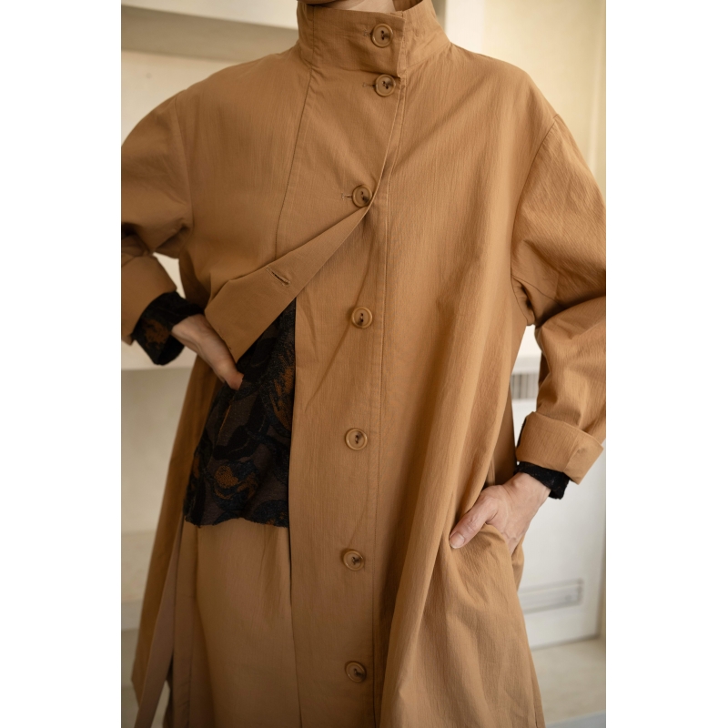 Cappotto leggero in cotone. Chiusura frontale a bottoni. Colletto alto. Spalla regolare e maniche lunghe. Tasche laterali inserite nel taglio. Vestibilità ampia e comoda.