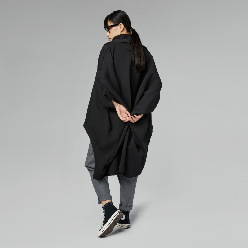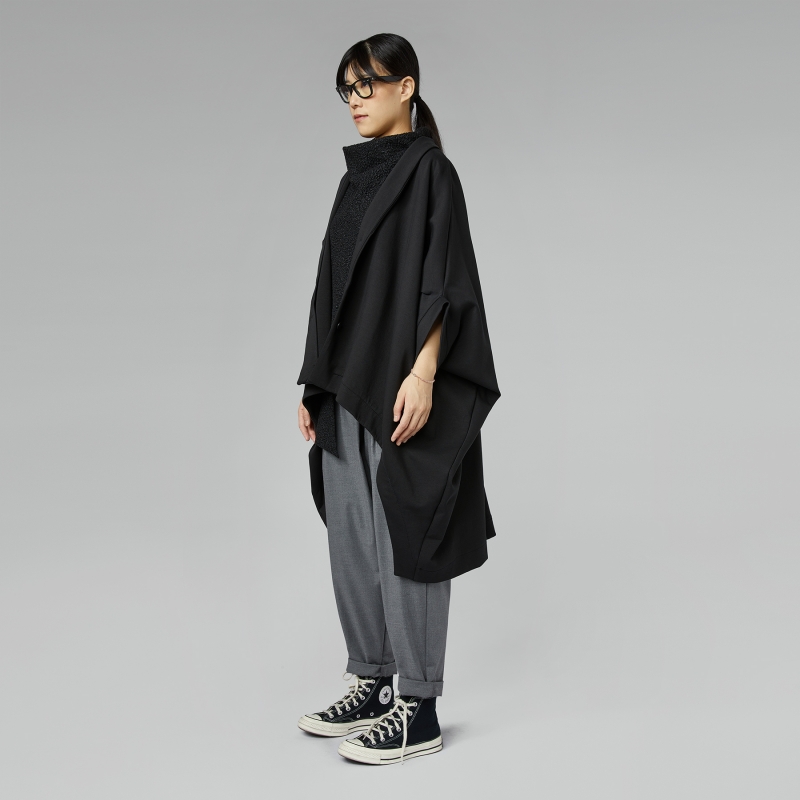 Giacca in felpa misto cotone con maniche a pipistrello. Colletto a scialle. Chiusura frontale a bottoni. Orlo irregolare. Stondato davanti e più lungo dietro. Mano morbida. Vestibilità comoda e over.
