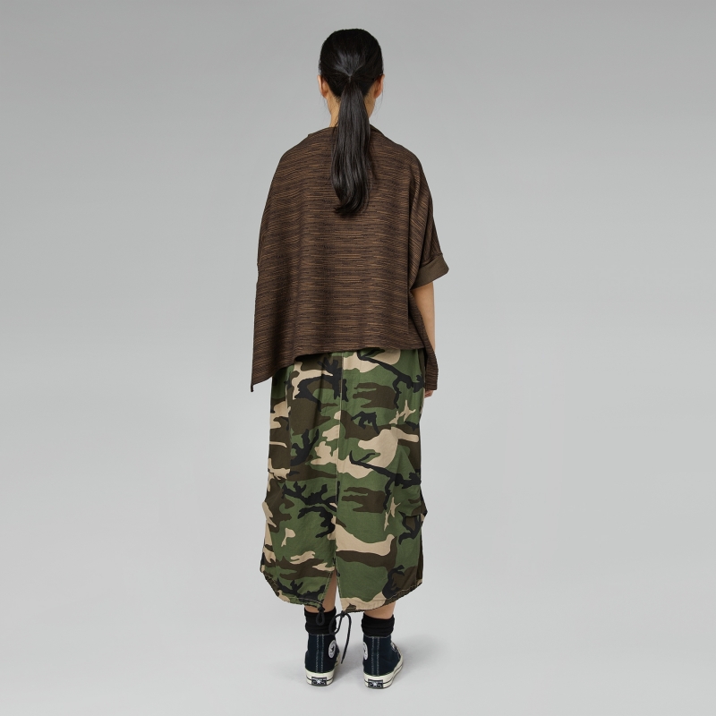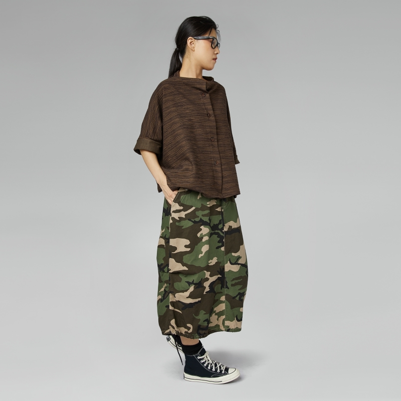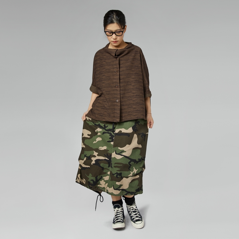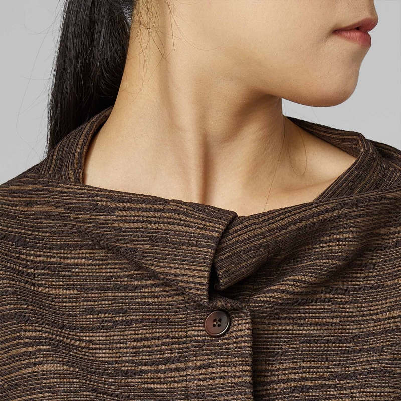 Cardigan striato in tessuto misto viscosa e polyester. Colletto morbido. Chiusura frontale a bottoni. Spalla calata e maniche lunghe. Taglio squadrato. Vestibilità ampia e comoda.