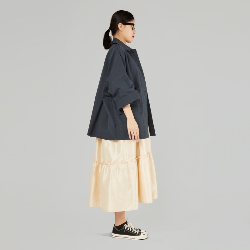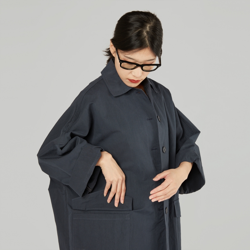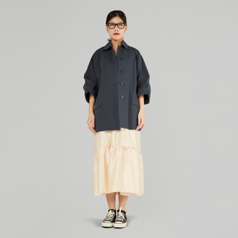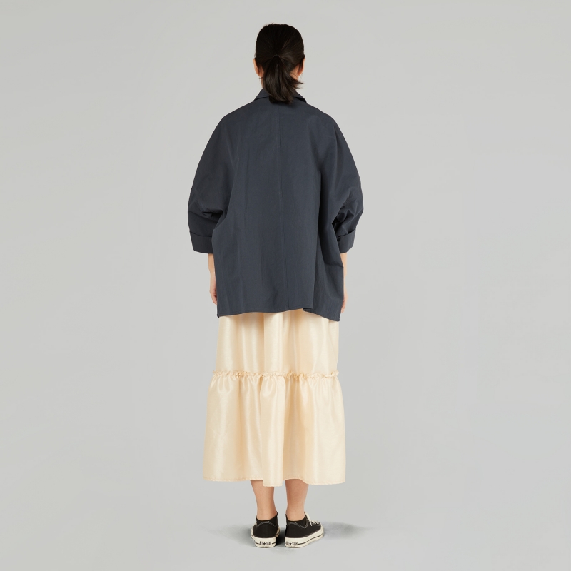 Giacca corta in gabardine misto cotone. Colletto a punta. Chiusura frontale a bottoni. Tasche applicate con patta. Spalle molto calate e maniche lunghe. Taglio squadrato. Vestibilità ampia e comoda.