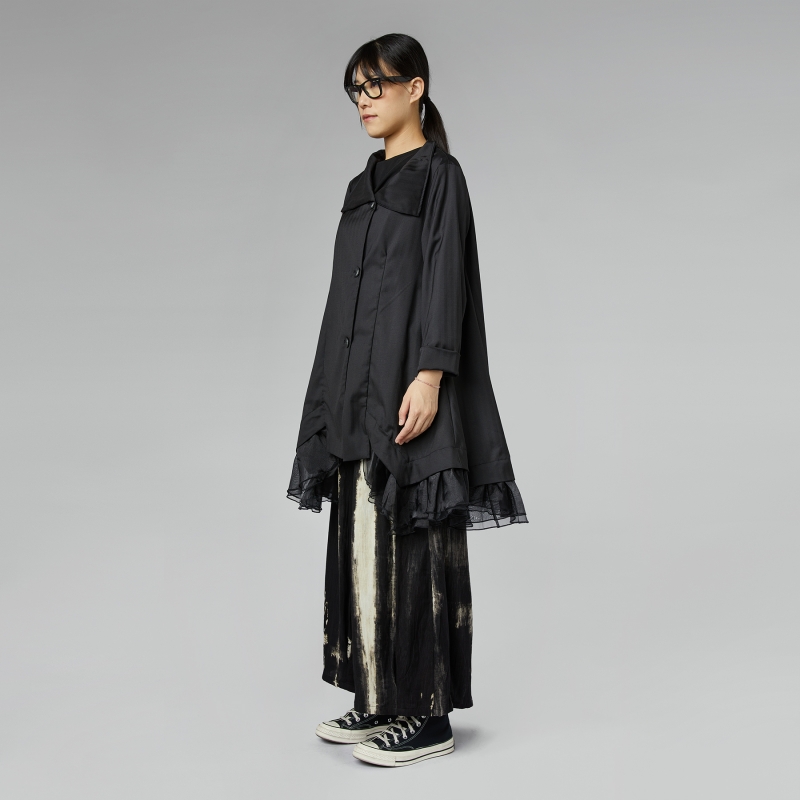 Giacca elegante a righe con dettaglio in tulle sull'orlo. Colletto alto morbido. Chiusura frontale a bottoni asimmetrica. Spalla regolare e maniche lunghe. Vestibilità regolare.